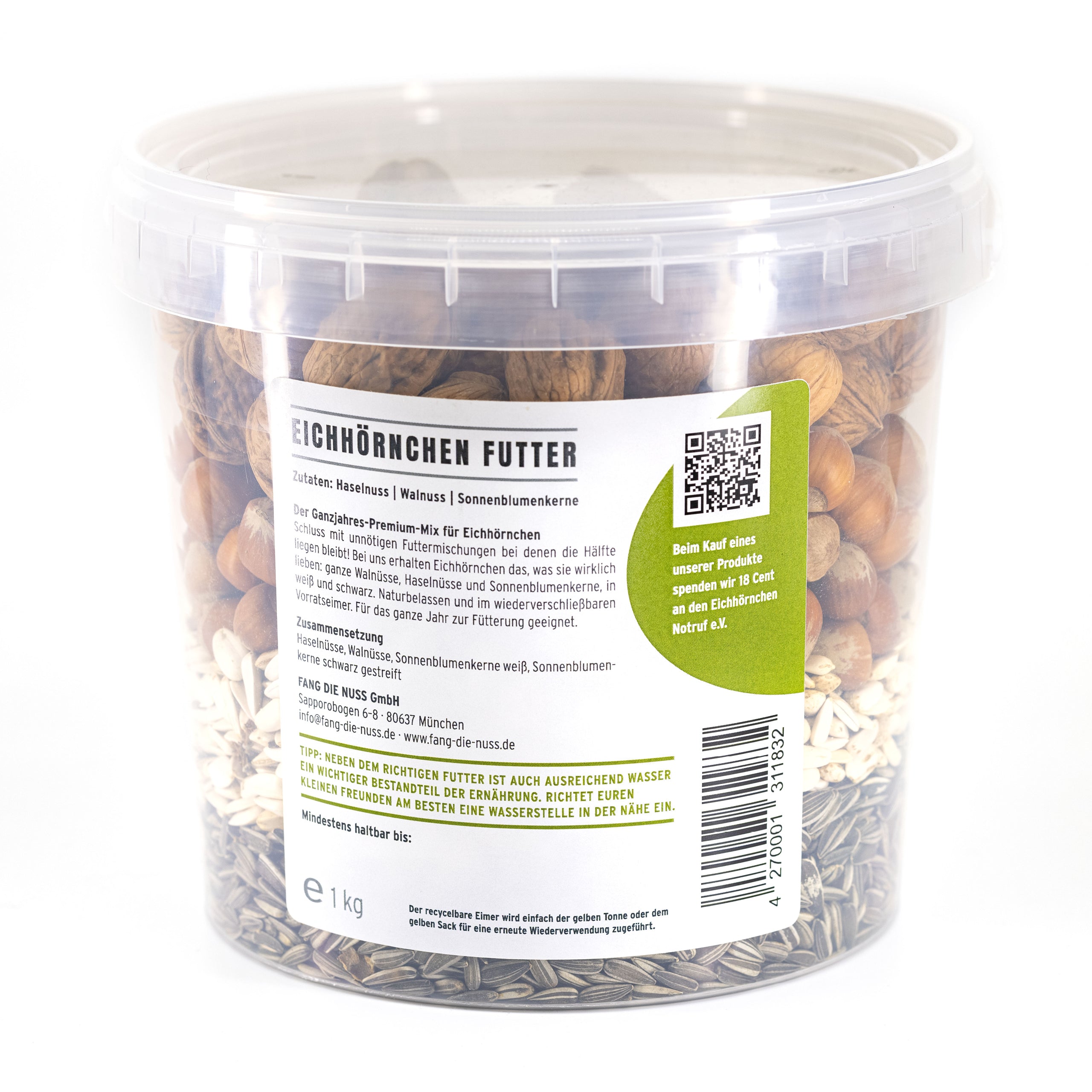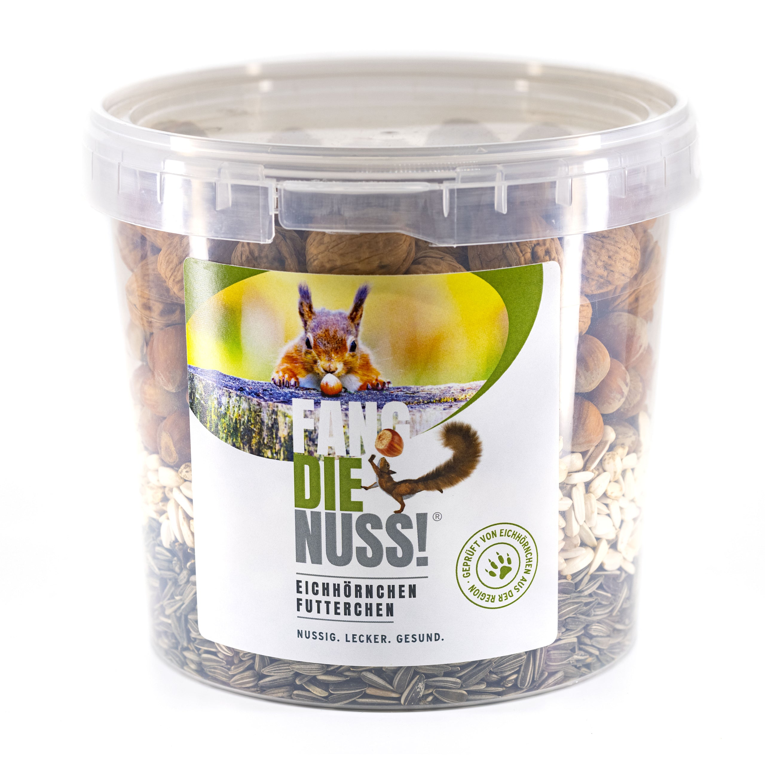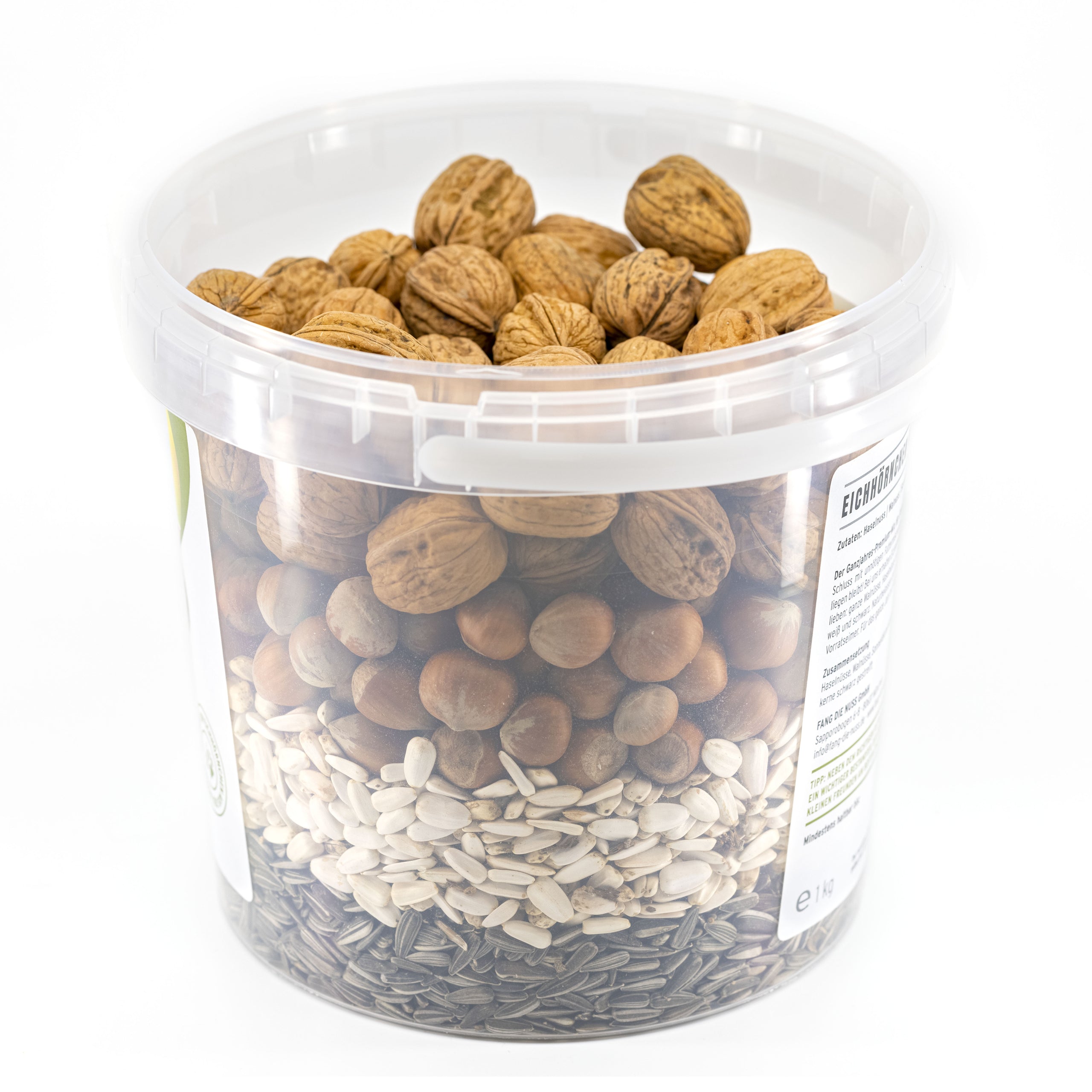Schluss mit unnötigen Futtermischungen bei denen die Hälfte liegen bleibt! Bei uns erhalten Eichhörnchen das, was sie wirklich lieben: Ganze Walnüsse, Haselnüsse und Sonnenblumenkerne, in weiß und schwarz gestreift. Naturbelassen und im wieder verschließbaren Vorratseimer. Für das ganze Jahr zur Fütterung geeignet.